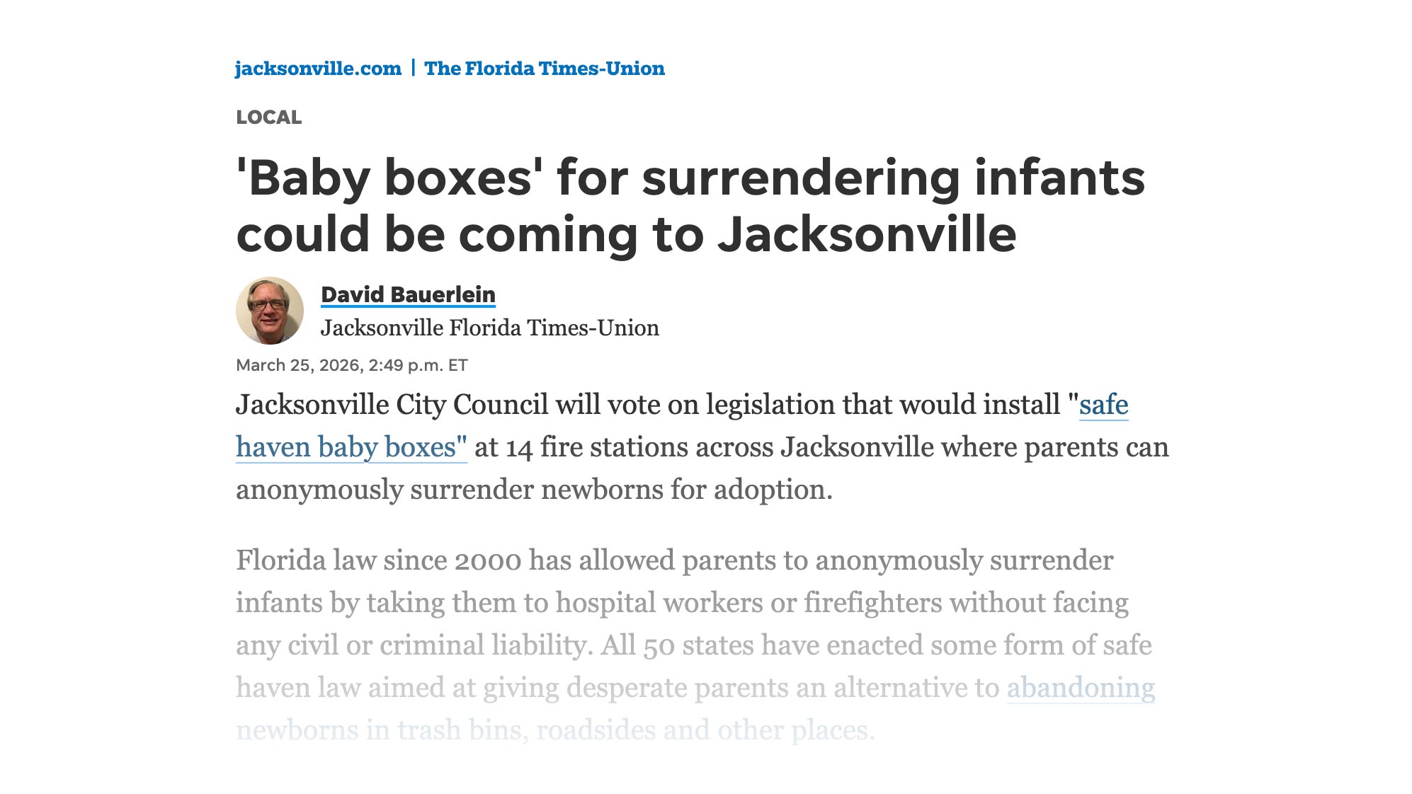 'Baby boxes' for surrendering infants could be coming to Jacksonville